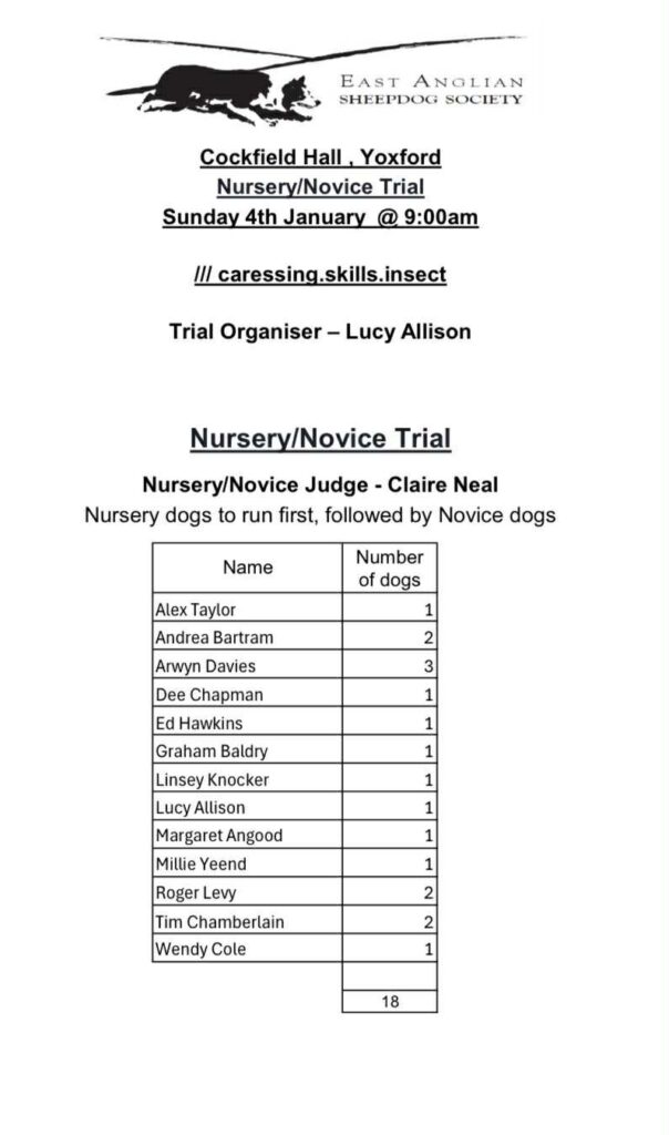 List of Runners for Nursery/Novice Trial at Cockfield Hall, Yoxford on Sunday 4th January 2026